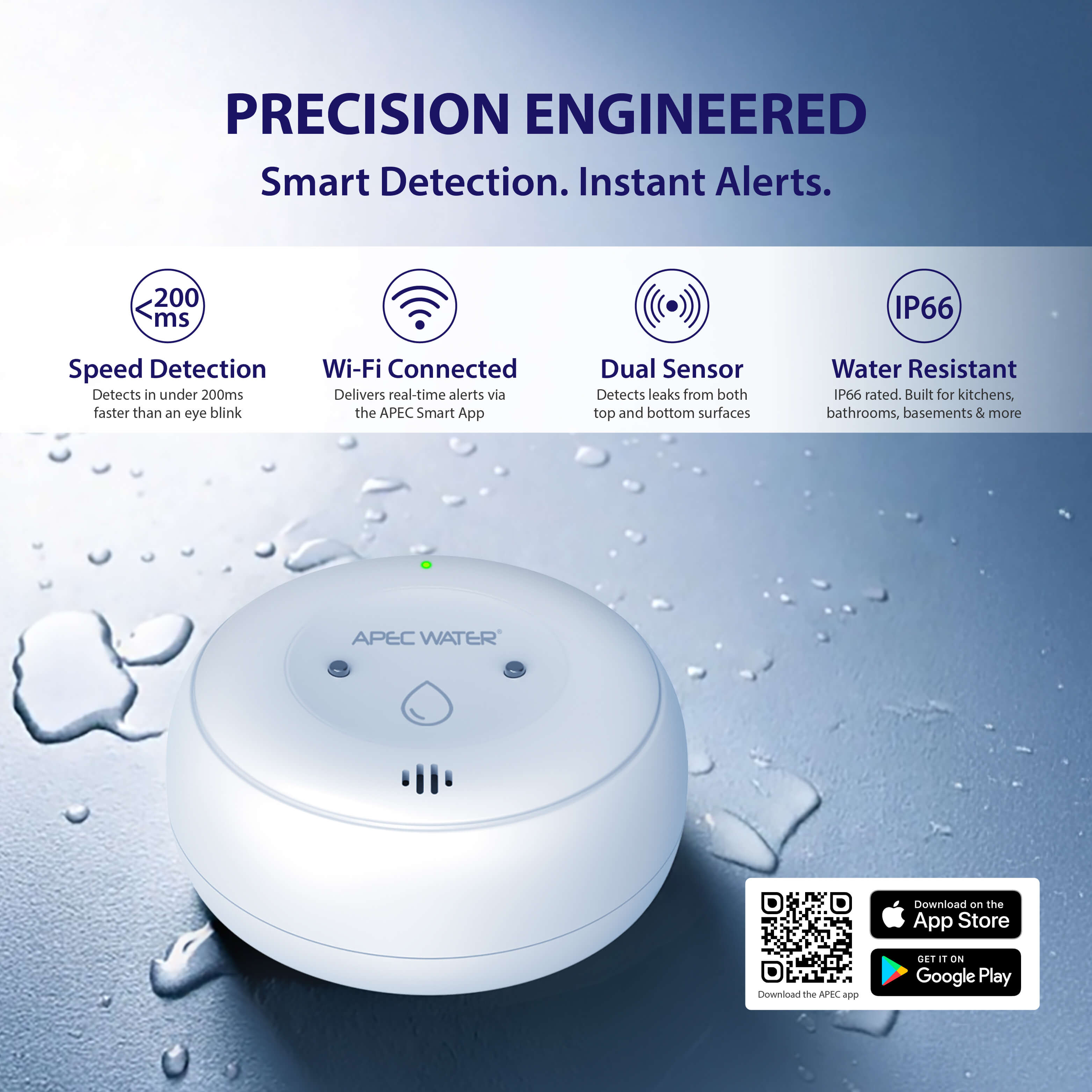 The APEC Smart Water Leak Detector provides dependable protection against unexpected leaks, giving you peace of mind anywhere in your home. This Wi-Fi connected sensor instantly sends push notifications to your phone if a leak is detected, helping you take action before damage occurs. Even without the app, the built-in alarm will sound to alert you immediately.