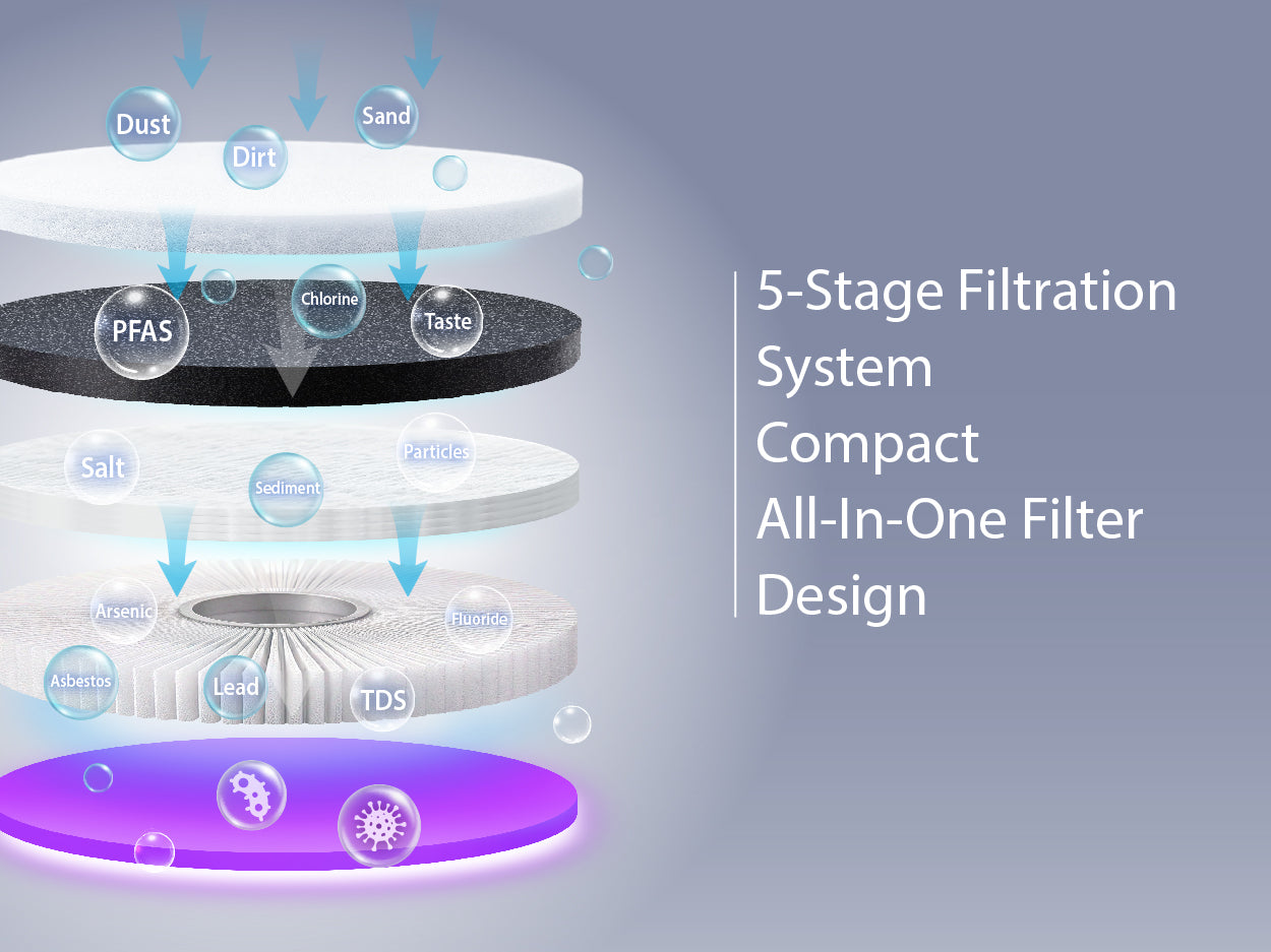 This countertop RO system features a 5-stage filtration design. A compact yet powerful system enables you to place it anywhere in your home while maintaining the same clean and healthy drinking water from any RO systems.