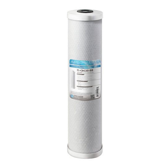 Reduce Chlorine And Chemicals In Your HomeAPEC FI-CBC20-BB carbon block cartridge is uniquely designed for whole house applications where high flow is desired. This activated carbon filter effectively removes chlorine, taste, odor and organic compounds to deliver clean, filtered water to every outlet in your home. It is compatible with 20 inch standard BB whole house housing and can treat large amounts of water at a very fast flow rate. The extrusion process allows the production of a carbon block with more carbon while eliminating the release of carbon fines commonly associated with GAC type cartridges. It can treat up to 100, 000 gallons of water. The 20 Inch model can treat over 100,000 gallons of water. Benefits and applications