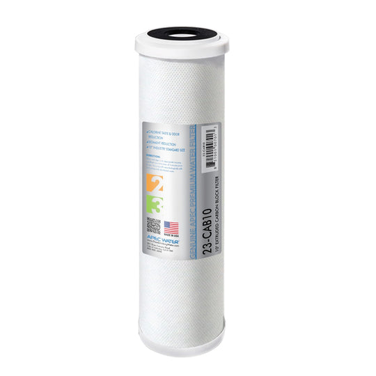 APEC's extruded carbon block filters consist of activated carbon particles fused into a uniform block with enhanced adsorptive capacity and efficiency. These carbon block filters flow in a radial (outside-to-inside) direction, providing increased dirt capacity and low pressure drop. Unlike granular activated carbon (GAC) filters, these extruded carbon block cartridges will not channel or bypass due to the extreme uniformity of their extruded activated carbon core. Service life of the APEC Extruded carbon block filter is greatly extended by a layer of 15 µm polypropylene spunbonded prefiltration medium.